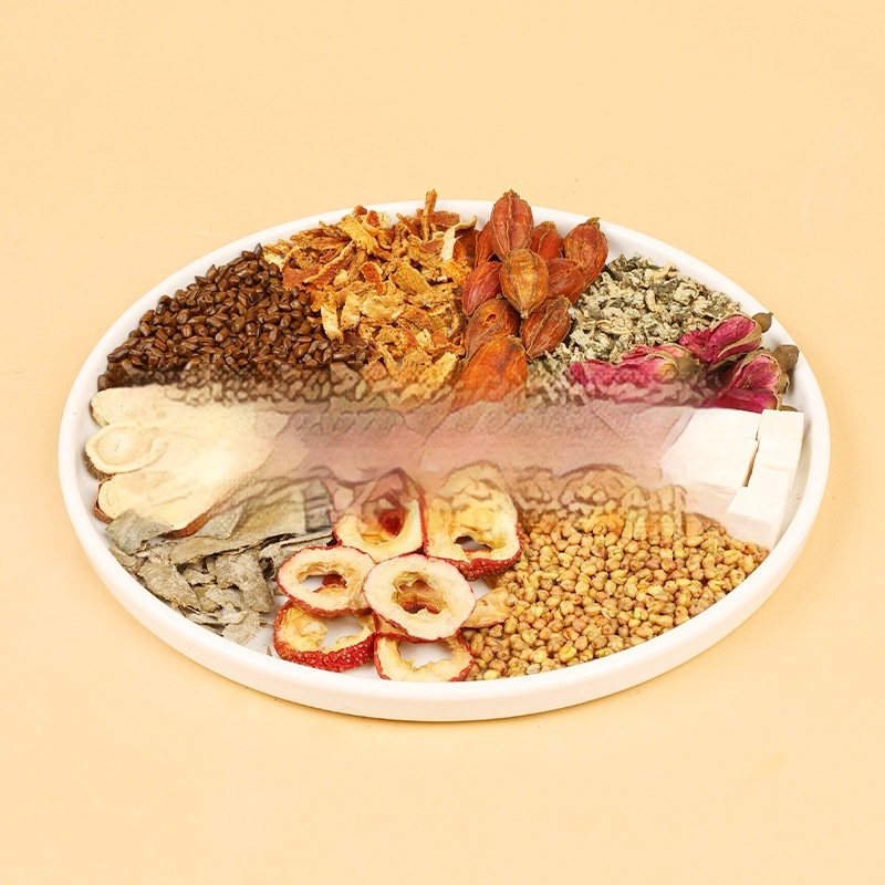 Ketsumeishi, wax gourd, red rose, lotus leaf, poria cocos, tartary buckwheat, orange peel, licorice, hawthorn, gardenia.